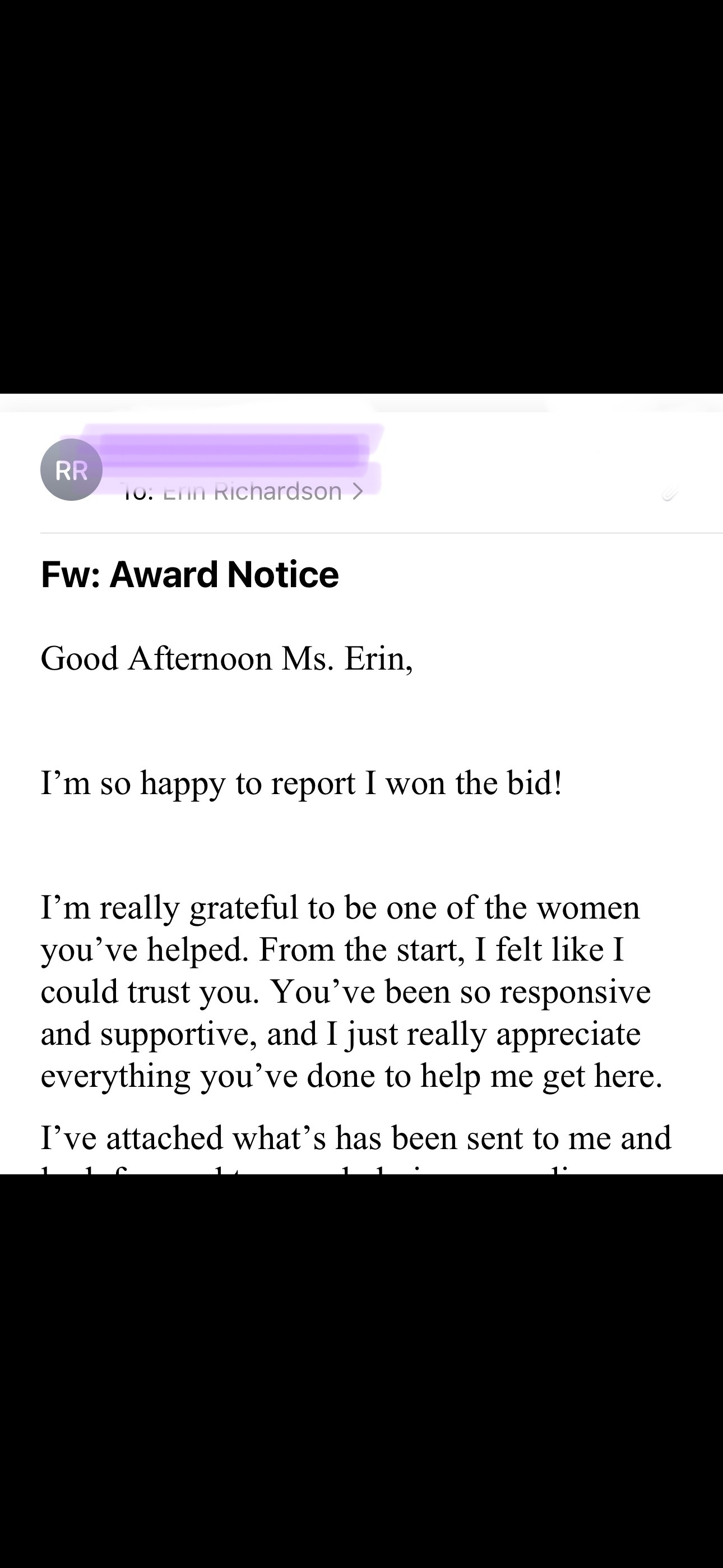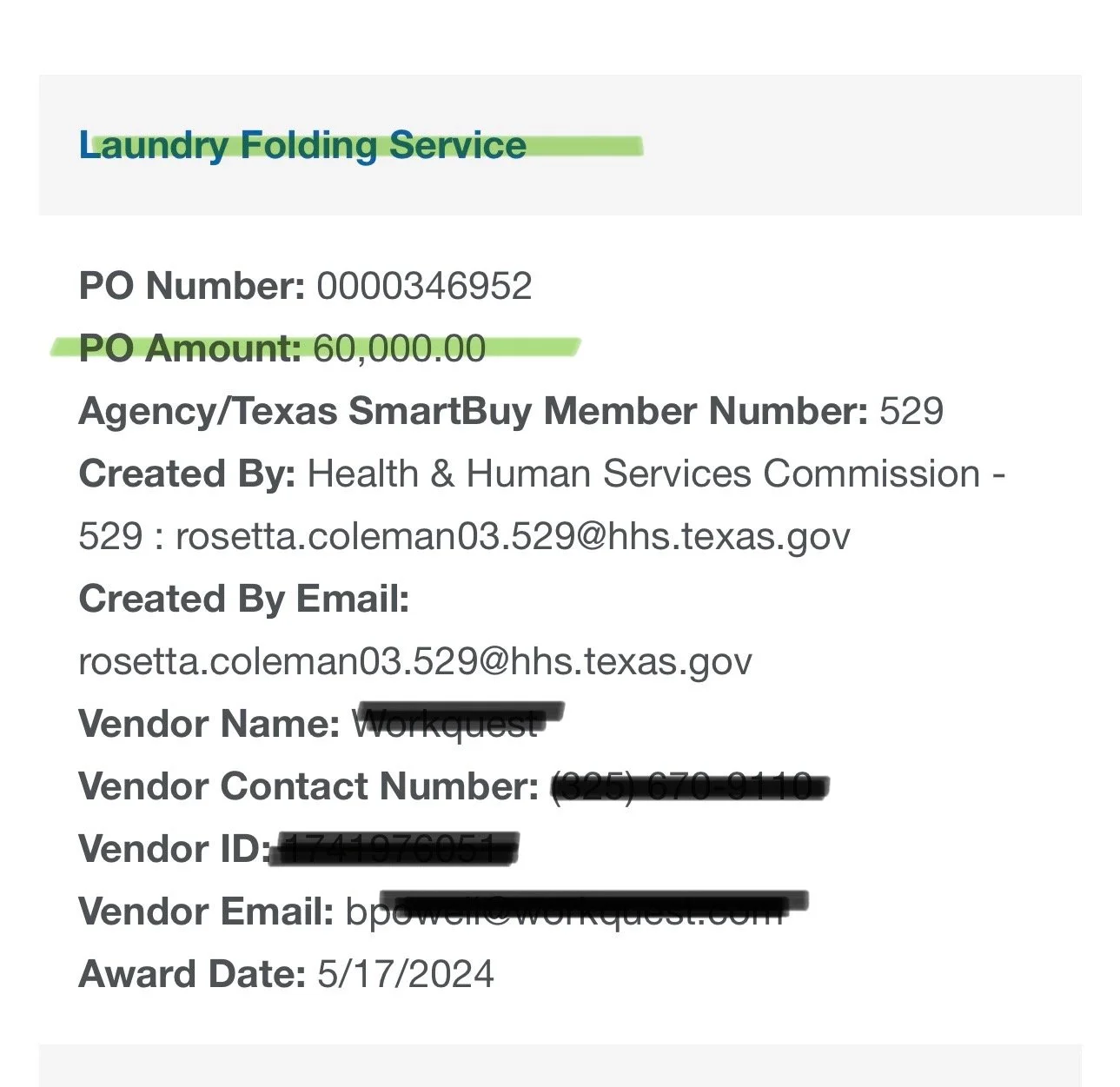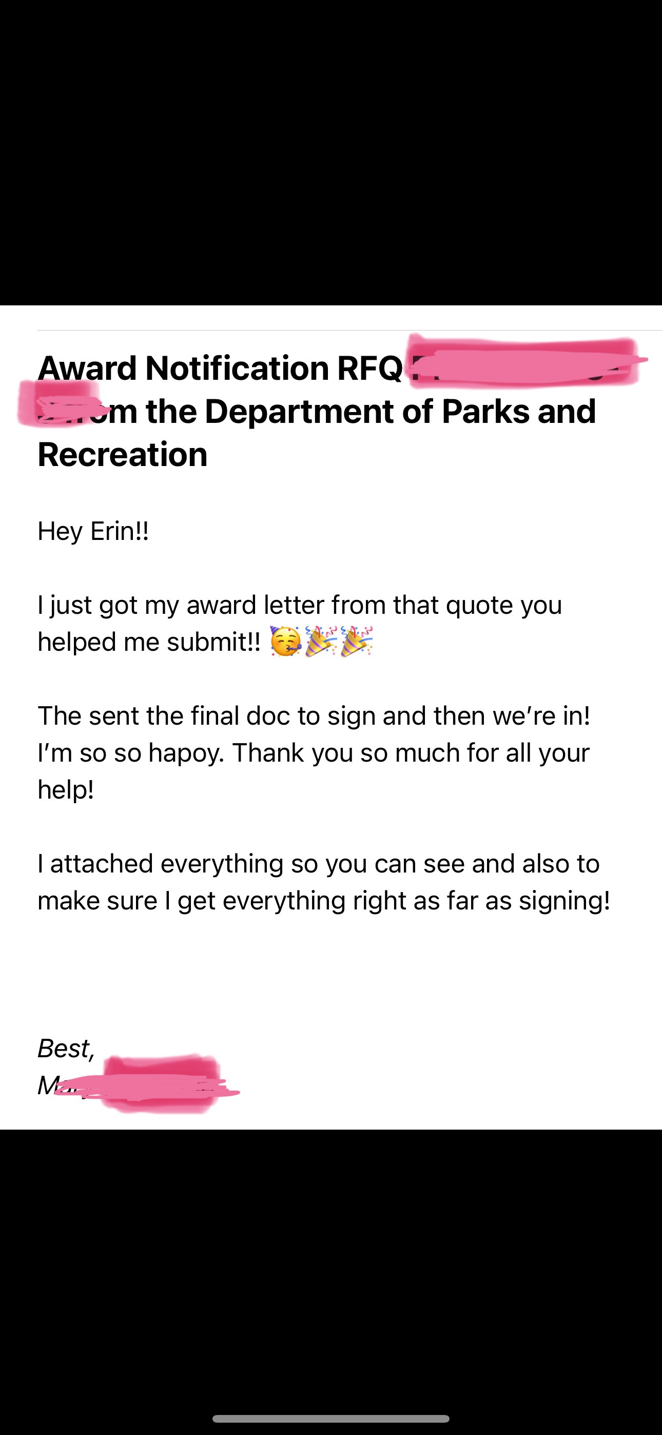 "Congratulations. Your company has been selected for award. Contract value: $87,500. Performance period: 6 months. Payment terms: Net 30."