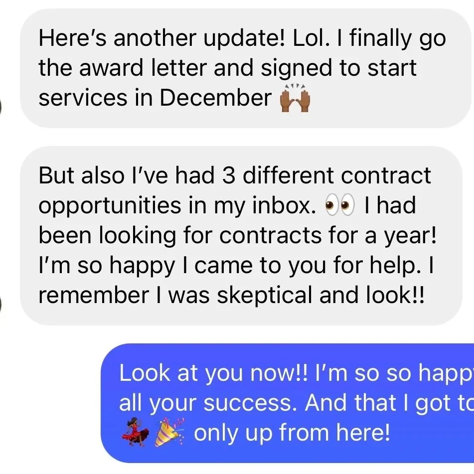 How? By following the exact steps I now teach: getting my business set up the right way, using scripts to reach out to contracting officers, and bidding on opportunities that fit what I could deliver.